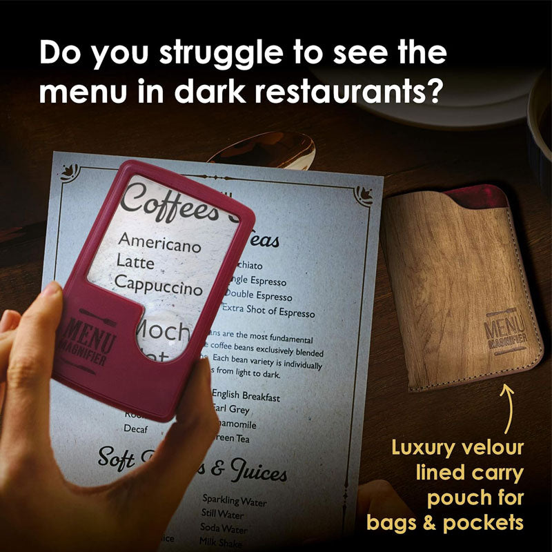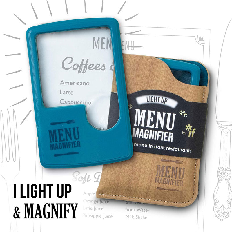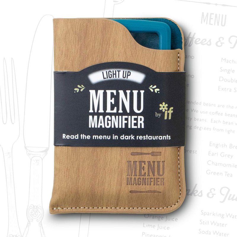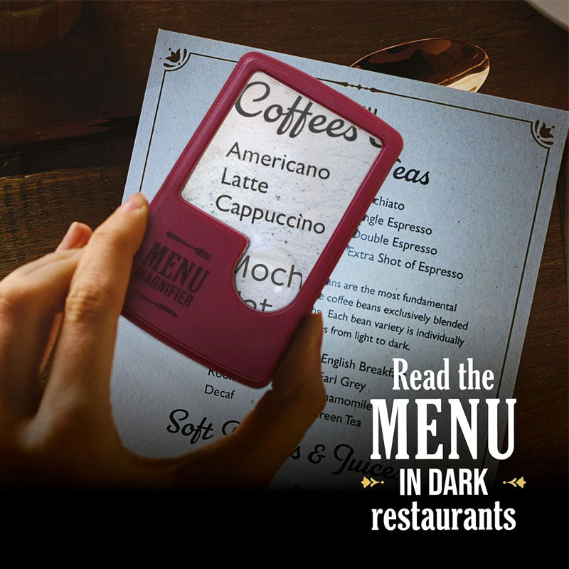 תאור זכוכית מגדלת מוארת לקריאת תפריטים