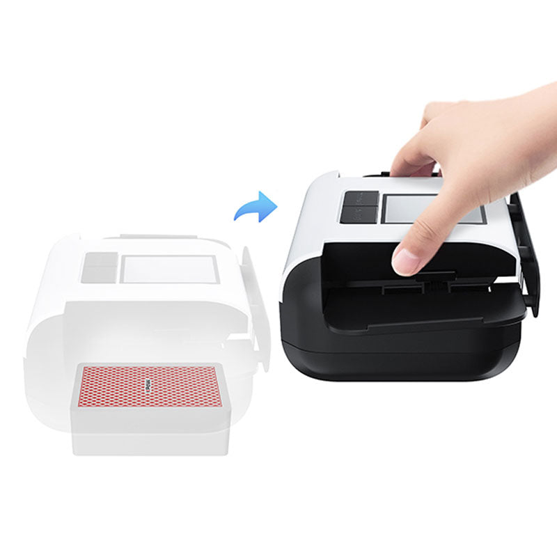 מערבב קלפים חשמלי אוטומטי זה מופעל באמצעות סוללה נטענת (כלולה) בחיבור USB (כבל טעינה כלול)