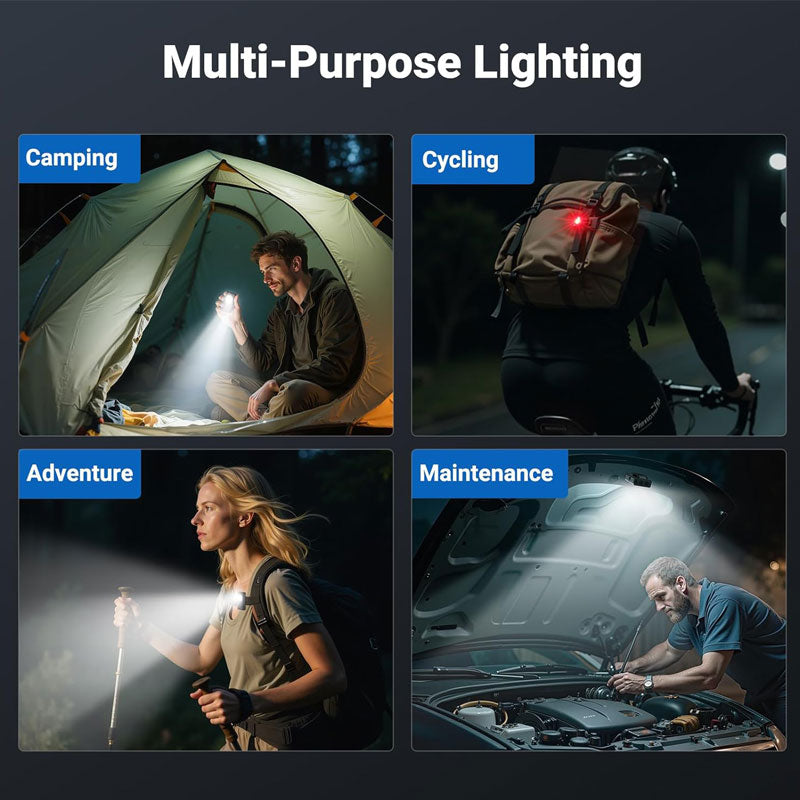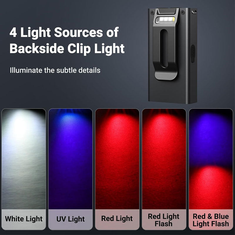 הורסטיליות של הפנס הזה היא מה שבאמת מבדיל אותו מהמתחרים. הוא מצויד ב-4 מקורות אור שונים (לבן, UV, אדום וכחול) המופעלים דרך 8 מצבי תאורה חכמים. תאורת ה-UV מאפשרת לזהות כתמים נסתרים, לבדוק שטרות או לאתר בעיות עור אצל חיות מחמד, בעוד שהתאורה האדומה והכחולה (כולל מצבי הבהוב) אידיאלית לסימון חירום או לרכיבת לילה בטוחה. בנוסף, הקליפס האחורי מאפשר לחבר אותו לכובע או לתיק ולהפוך אותו לפנס ראש מאולתר, והמגנט החזק בתחתית מאפשר להצמיד אותו למכסה המנוע ברכב או לכל משטח מתכתי לעבודה בשתי ידיים חופשיות.