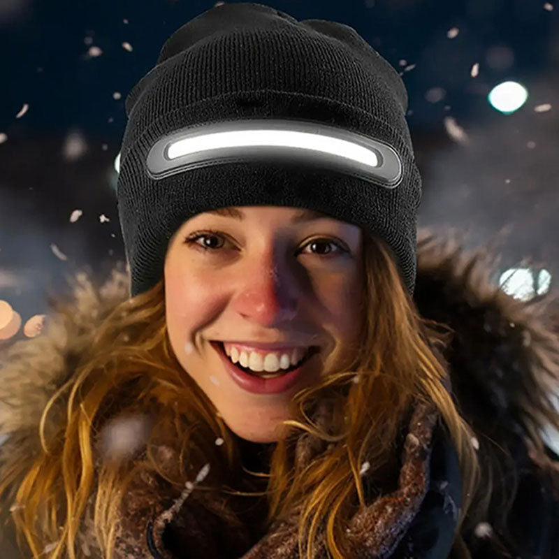 כובע צמר עם פס תאורת COB זה מופעל באמצעות סוללה נטענת בחיבור USB (כבל טעינה כלול)
