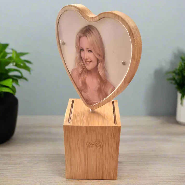 העיצוב החכם של המסגרת מאפשר מקסימום תצוגה במינימום מקום. היא מציעה מקום ללא פחות מ-4 תמונות שונות: שתי תמונות מעוצבות בתוך הלב המסתובב (משני צדדיו), ועוד שתי תמונות מלבניות בבסיס הקובייה. אבל השדרוג האמיתי מגיע כשמחשיך! המסגרת כוללת תאורת LED עדינה, שהופכת אותה למנורת לילה רומנטית המאירה את פני היקירים שלכם באור חם ומרגיע.