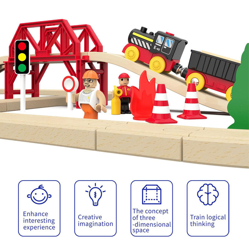 • ערכה עשירה: 41 חלקים הכוללים מסילות עץ, גשר, דמויות ואביזרי נוף