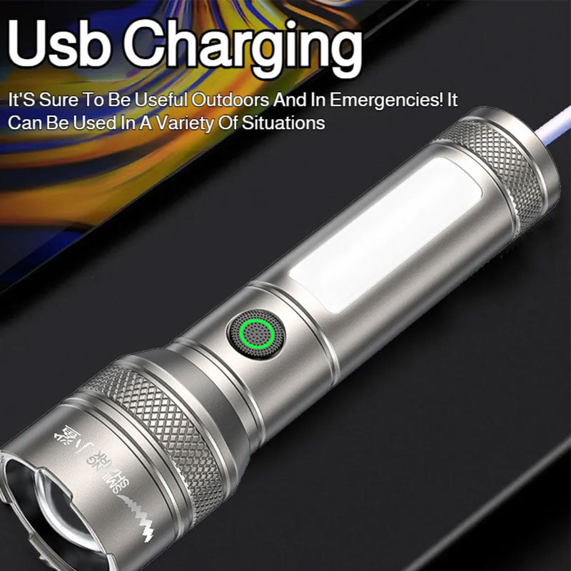 פנס טקטי עוצמתי עם זום ופוקוס משתנה זה מופעל באמצעות סוללה נטענת בחיבור USB (כבל טעינה כלול)
